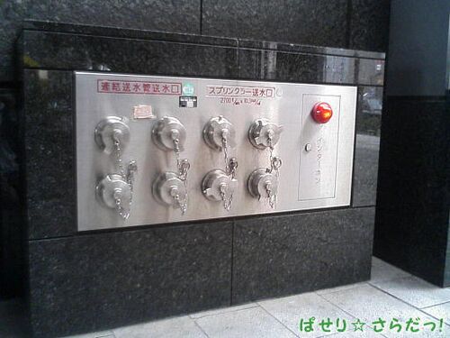 <みた日:2006/5/14>シネマシティ・『陽気なギャングが地球を回す』 (写真:シネマシティの連結送水管・スプリンクラー送水口、これは消防隊が各階の屋内消火設備に消火用水を送水する際に利用するモノ。消防隊が駆けつけてすぐ作業できるよう、建物の目…