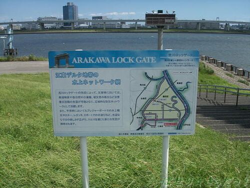 <お散歩日:2006/9/10:航空写真> 荒川ロックゲートは、江東区内の内陸運河と荒川を船で行き来するための施設。小名木川閘門が昭和50年代に閉鎖されてからは、通行できなかったそうだ。 案内看板 堤防上にある荒川ロックゲートの施設案内看板。 ロックゲ…