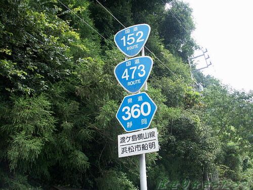 <お散歩日:2007/7/29:航空写真> 静岡出張シリーズ♪道の駅からすぐだけど、国道に車を駐めて、ちょっと一息。この調子じゃおうちになかなか着かないぞ。 国道・県道標識 見事な路線の併走。山沿いの道って、道路を造れる所が限られるからだろう。 船明ダ…