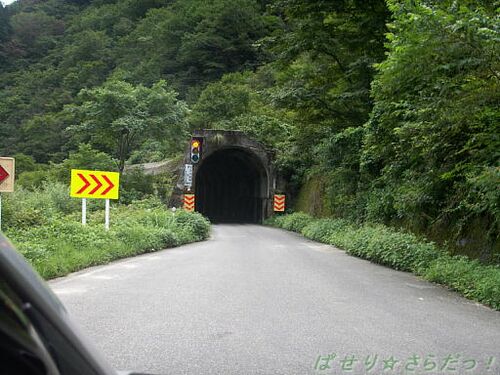 <お散歩日:2007/9/2> 赤谷線跡からさらに進むと、赤谷鉱山専用線跡を通ることになった♪ いかにも線路跡 雪除けのトンネルの入口。トンネル(洞門)は、一車線分しかないので入口に信号機。 トンネル(洞門)の様子 どう見ても線路の跡地。検索で調べると…