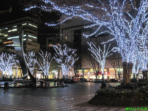 <お散歩日:2011/12/7> 千葉中央公園付近のイルミネーション。2011年は復活! 全景 2011年からはLEDを中心とした、白いイルミネーションになった。 ちはなちゃん 千葉市のマスコットちはなちゃんが中心部の塔に。 太陽光発電システム プレハブの天井に…