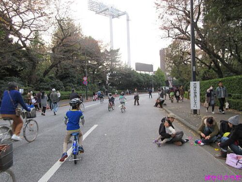 <お散歩日:2015/11/22> 国立競技場(跡地)周辺をお散歩しますよ~♪ 周回道路は自転車パラダイス 日曜日の昼間は自転車専用道路になります♪子供達が安全と言うことで、子供自転車が多いです。 車両通行止めの看板 周回道路にたどり着くまでが危険かも。。…