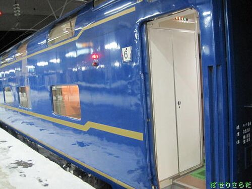 <日付:2014/1/18> おそらく最後となるブル-トレイン乗車、外見をよーく観察しました♪ 6号車 2階式に改造された寝台車です♪改造された車両も色々寄せ集められています♪ オハネ24555 古いグループの24系24型客車もまだ健在でした♪製造当初3段寝…