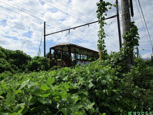 <日付:2014/8/31> 大井川鐵道を一日楽しむお散歩シリーズ♪休止線の探検から大井川沿いに進みます♪ 廃電車の後ろ側 窓の無い遊覧車両のように見えます♪ 線路終端方向を見る 3つの線路が一つになる配線のように見えます♪ 車止めがあるだろう付近 架線の終…