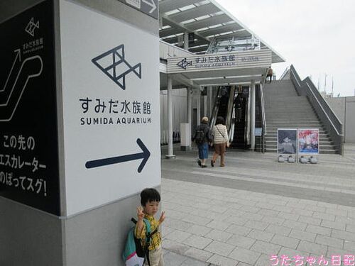 <日付:2019/4/21> すみだ水族館は桜満開 春のイベント最終週のすみだ水族館に行ってきたよ♪ すみだ水族館入口エスカレーター前にて いつもの記念撮影です♪ 最初におみやげを買いました うた坊のさくせんです♪(荷物になって重いのに。。。。) おさかな大…