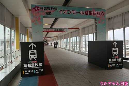<日付:2023/3/17:20230317> 明日開業となるJR京葉線幕張豊砂駅を見てきた。 ファミリーモールとペットモールの連絡橋に設置された開業祝いの装飾 通常の案内も幕張豊砂駅を入れたものに ファミリーモール2階の駅からの入口付近 駅前ロータリーはほぼ完…