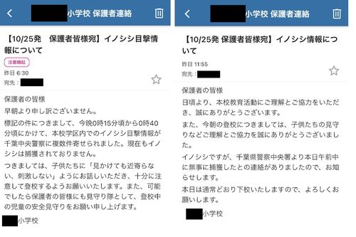 <日付:2023/10/25:20231025> 6:30朝から小学校から『イノシシ目撃情報』の連絡があり大騒ぎ、通学時間の見守りも喚起 11:55お昼頃『イノシシ捕獲連絡』があり、騒ぎは収まった。 うたちゃんは、どういう反応かと言うと、捕まって殺されたらかわいそう…