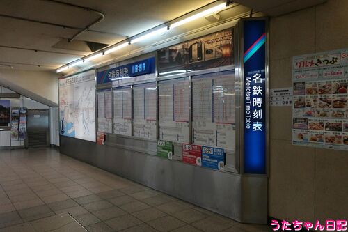 <日付:2023/5/31:20230531-03> 名古屋周辺の乗り鉄の日の記録 ずらりと並んだ名鉄名古屋駅各方面の時刻表と系統図 きっぷうりば付近のようす、主要駅や指定券の料金を大きく表示 ほぼ地上の高さにある北口改札外コンコース ミュースカイチケット売場、定…