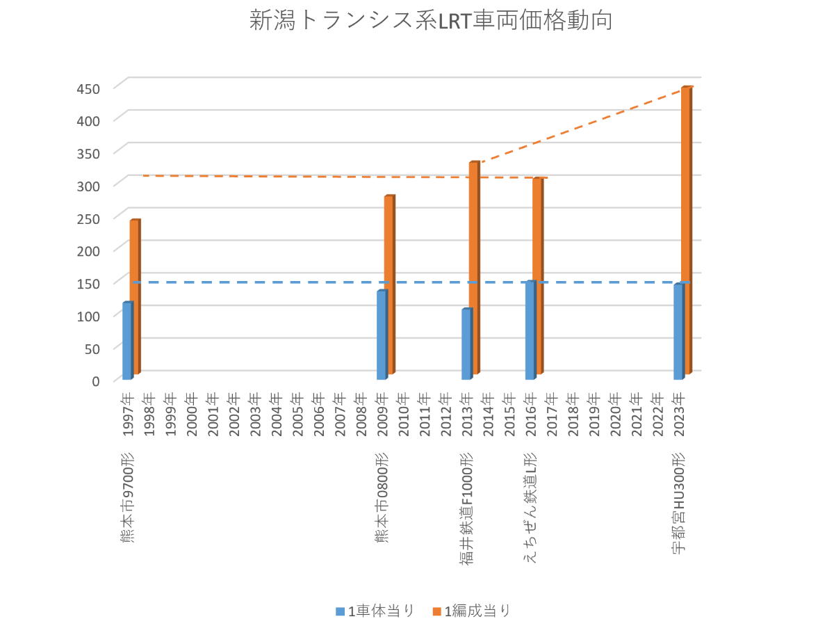 ・えちぜん鉄道L形は、同時期導入の熊本市交通局0800形の価格に近似しているが、F1000形より高くなってはいけないので、この価格と言うことなのだろうか?