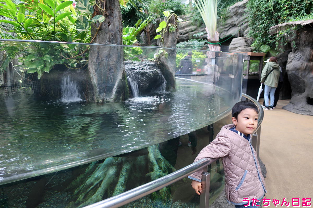 後ろ側の水槽は肺魚、雨の日は両生爬虫類館がおすすめです。