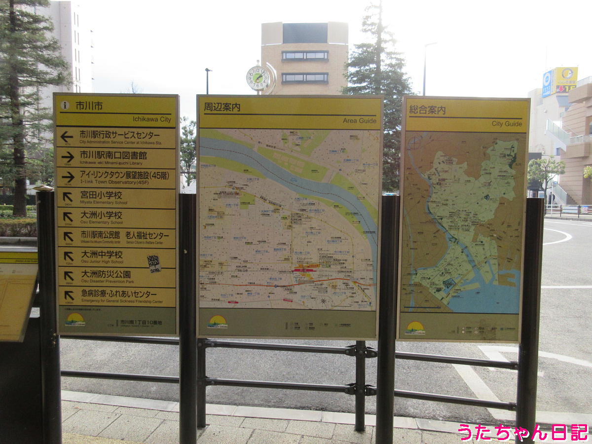 市川駅南口周辺案内図(周辺案内と総合案内の地図の向きが違っているが、これはあえてそうしているのだろうか?)