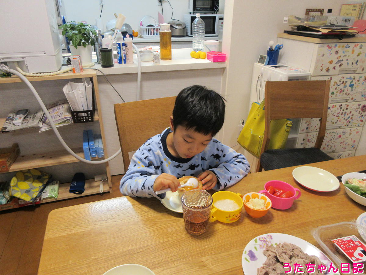 コーンスープのポットパイに夢中、おいしそうに食べています