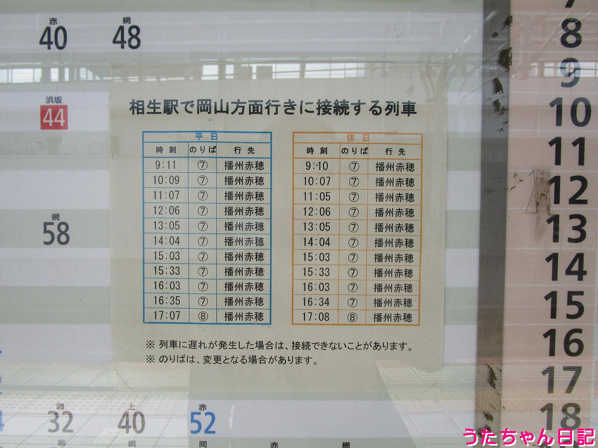 昼間時間帯は山陽本線の岡山方面行きが無く、赤穂線の播州赤穂駅行きに乗って乗換が必要との案内