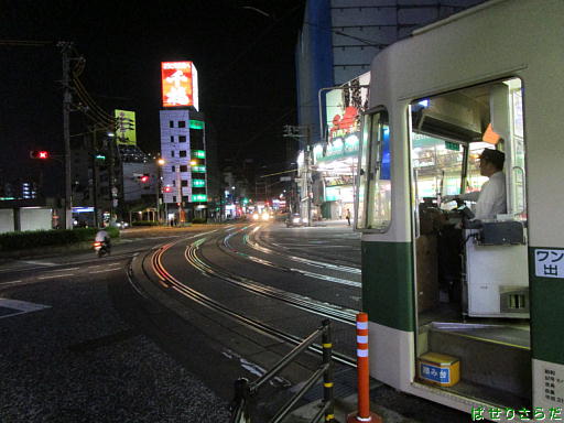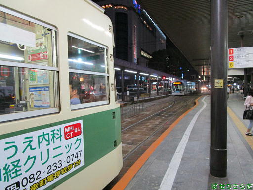 広電広島駅で出発を待つ電車、ギリギリ前で待つ