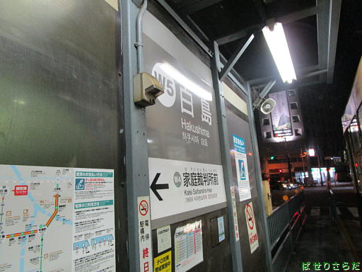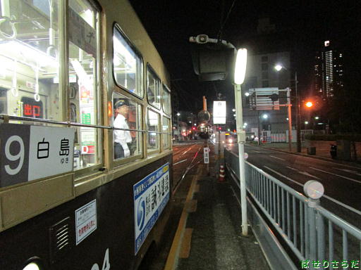 折り返し地点である白鳥電停八丁堀方のようす、中(後)乗り前降りなので、先方には要が無い