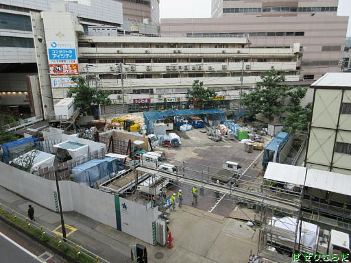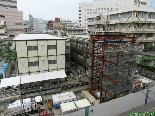 旧JR千葉支社跡地(道路をまたぐコンクリート圧送パイプや高電圧線が通っていた)職人さんの移動も仮設橋梁でやっていたみたい。