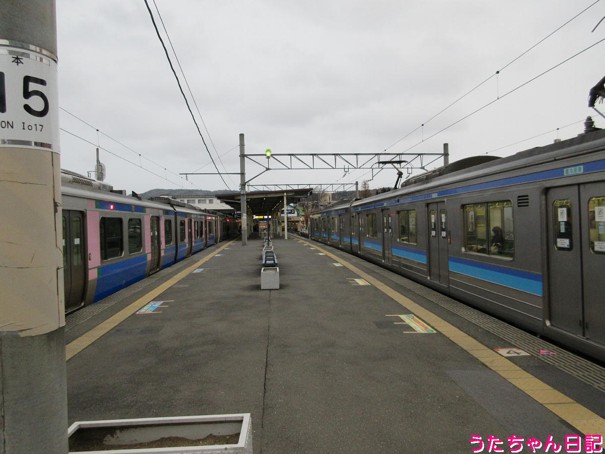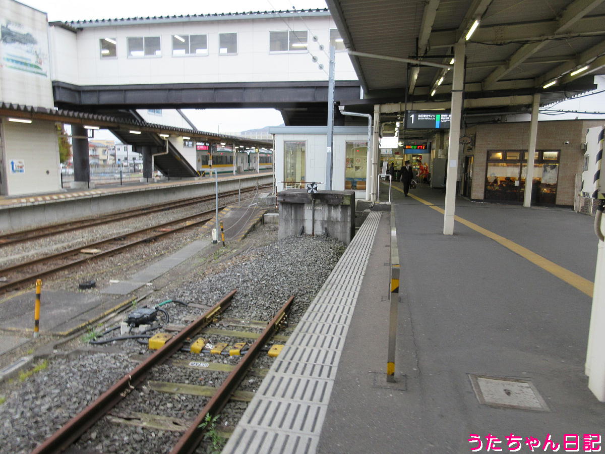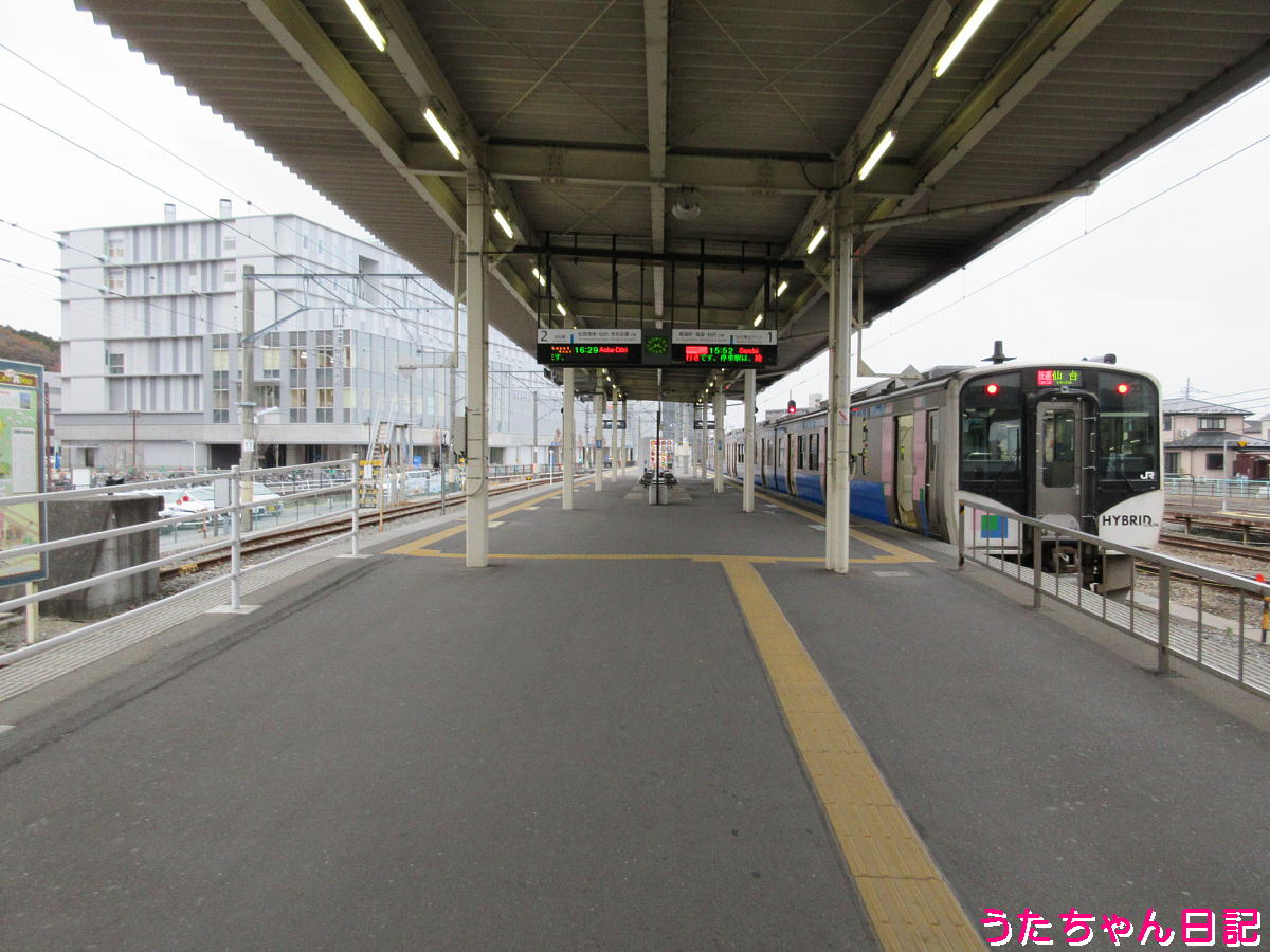 石巻駅仙石線ホームのようす、1番線(右側)に仙石東北ラインのハイブリッド気動車が停車中。番線の振り方が変則的なのは、駅統合の名残だろうか?