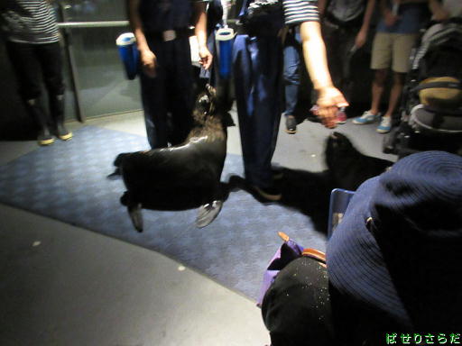 ペンギンの水槽を掃除しているお兄さんを観察中