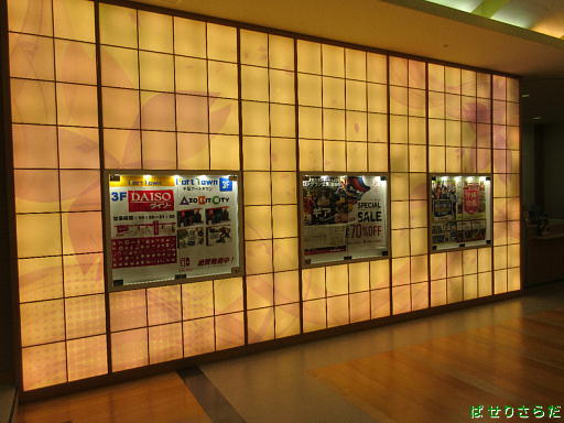 派手に改装された電飾壁と、その中の普通の掲示板。日本的な作りなら、壁は光らずモニター掲示板にするだろうと思われる。
