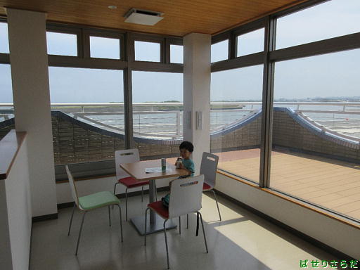 2階展望できる休憩室のようす、1階で買った食べ物を食べられます