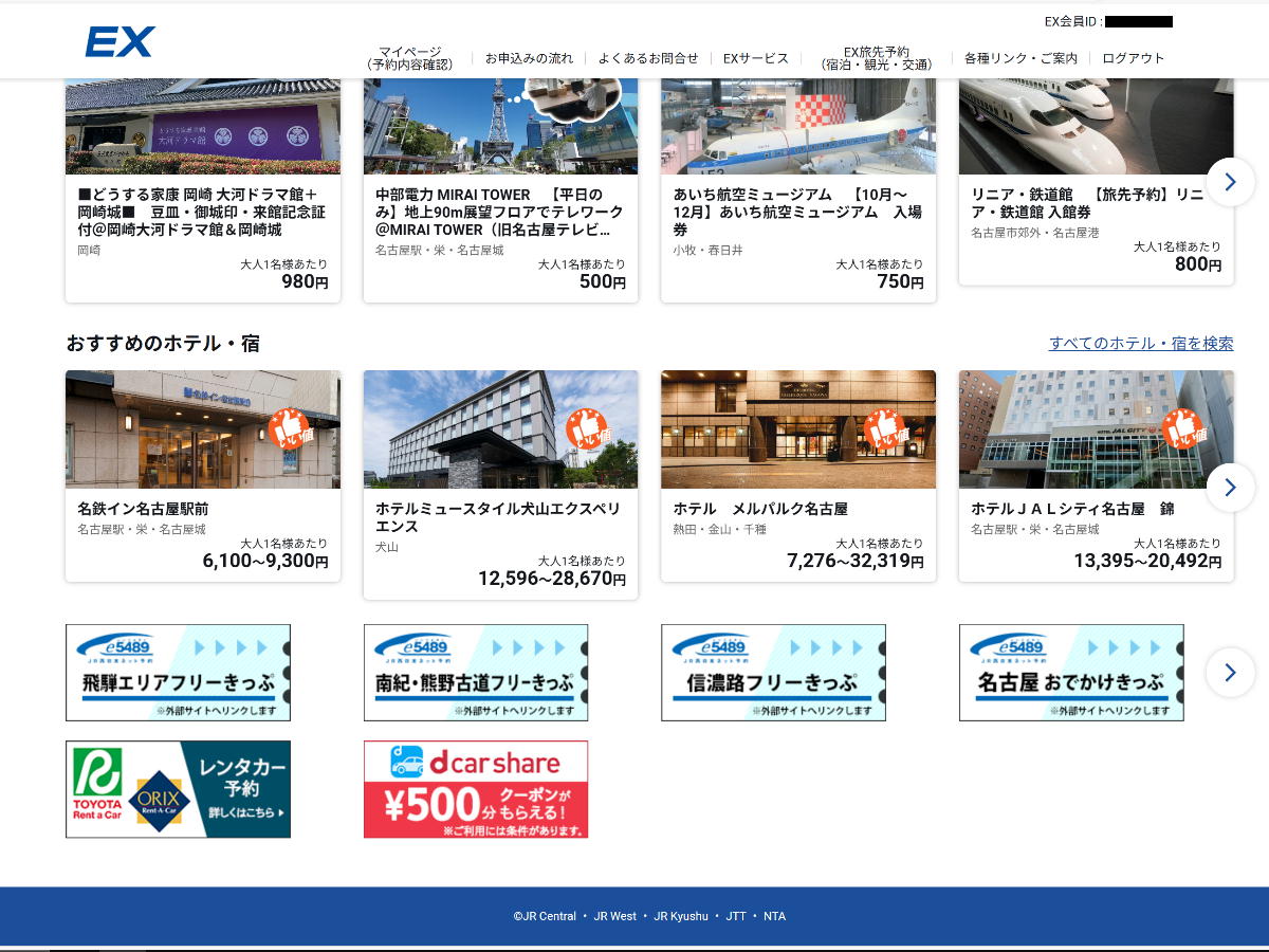有料会員ログイン初期画面、EXサービス拡充の目玉が一番下のリンク【EX旅先予約】【EX旅パック】【駅や社内のサービス】