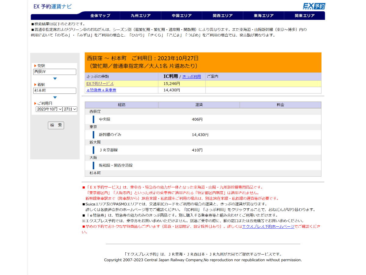 JR東海は、EX予約(無料会員)の勧誘に重きを置いているようで、普通に検索すると下画面の【EX予約運賃ナビ】しか検索されない。
