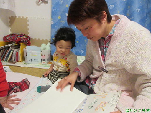 スケッチブック、お絵かきしたスケッチブックをママと見ています♪